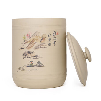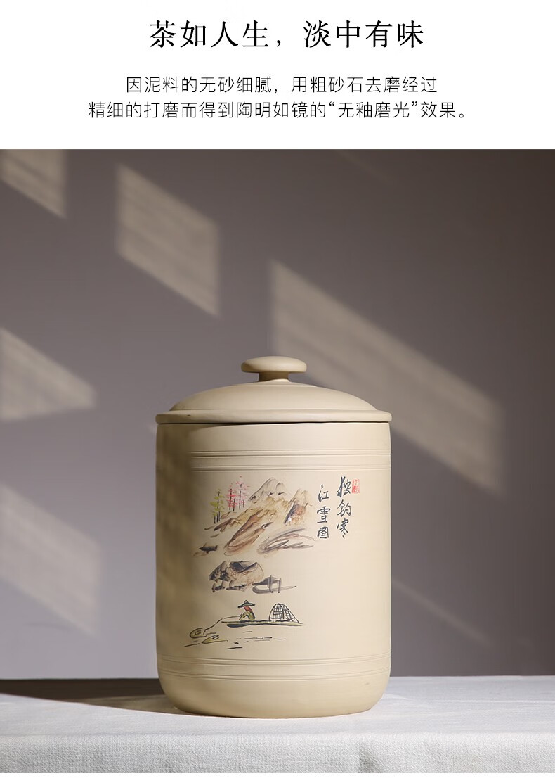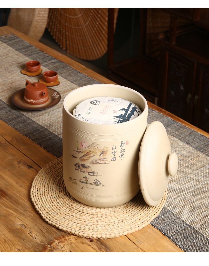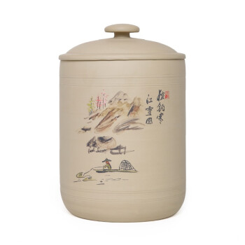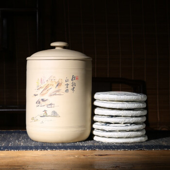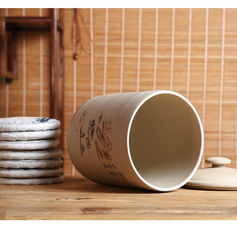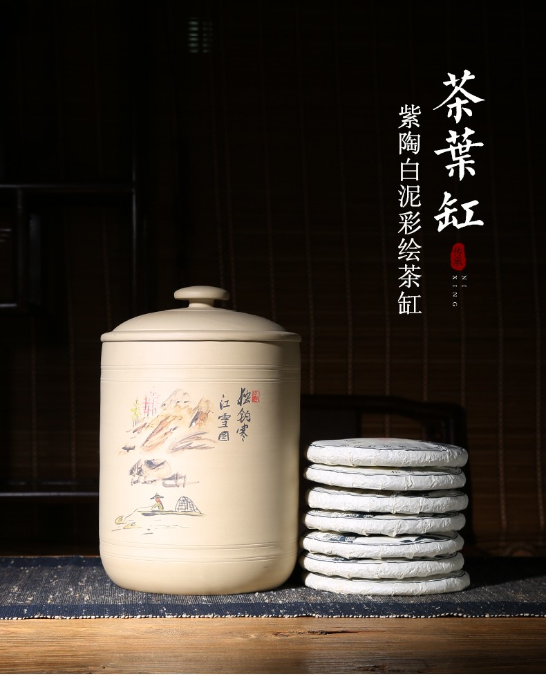 紫陶白泥 7饼茶缸大号山水彩绘陶瓷茶叶缸